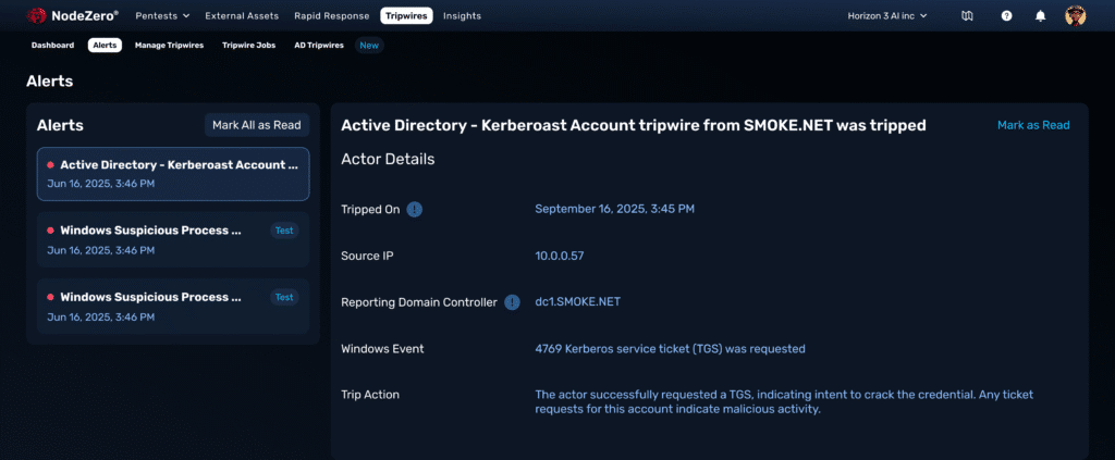 Tripwires confirm our SOC can detect and respond to real AD exploitation attempts.