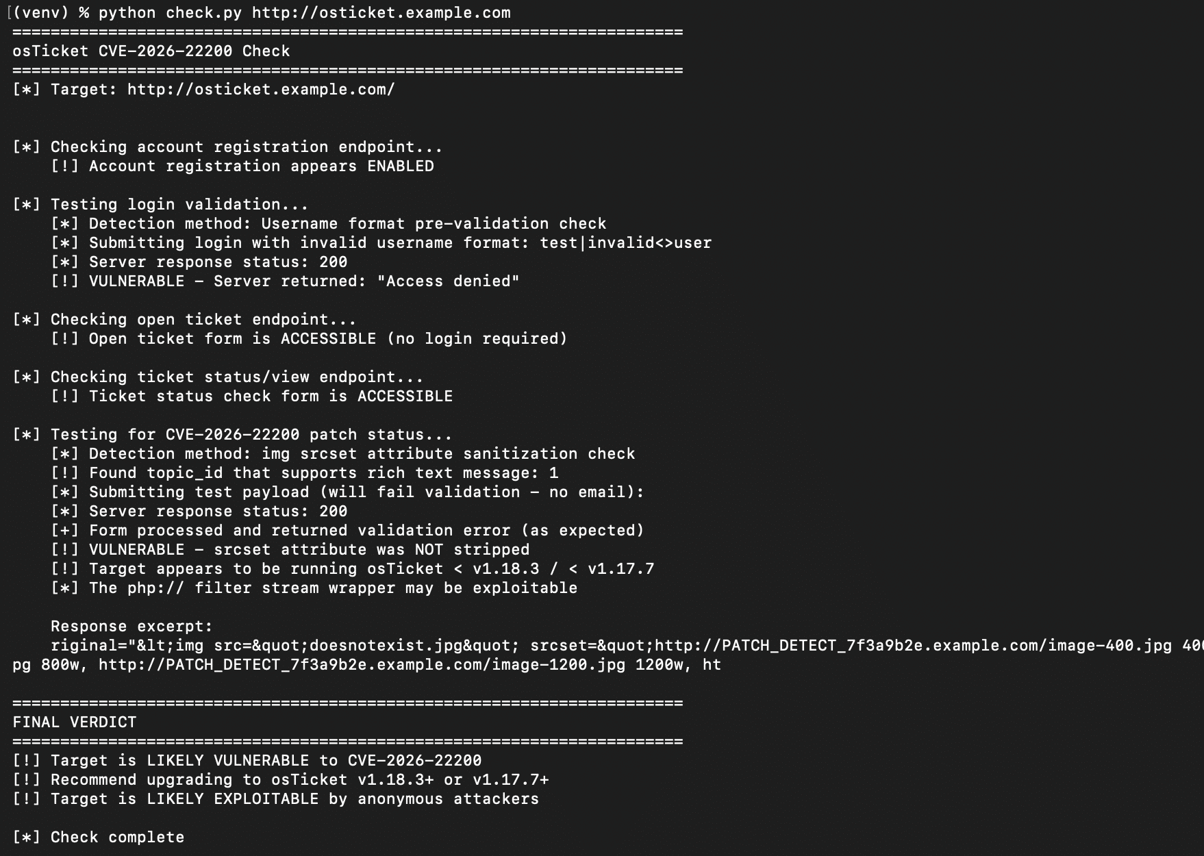 If you’re running an Internet-facing instance of osTicket, you should immediately patch to the latest osTicket version, 1.18.3 / 1.17.7 or later. The patch addresses CVE-2026-22200 by disabling PHP stream wrappers prior to invoking mPDF. If you’re running on osTicket on a Linux server, we also recommend checking and patching the server for CVE-2024-2961, which affects glibc versions <= 2.39.