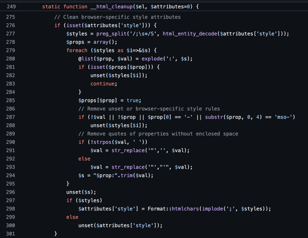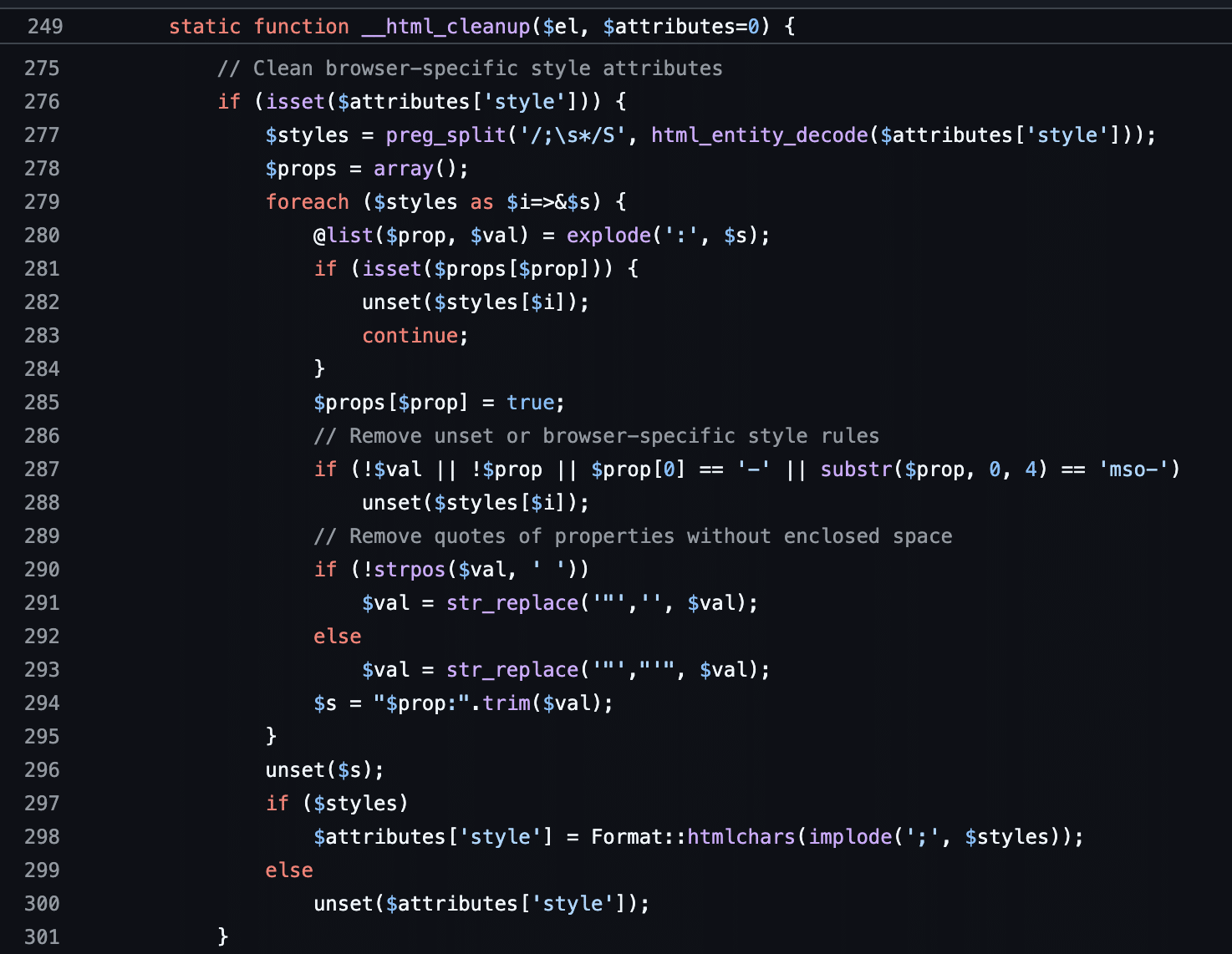 Even with a bypass for mPDF, we still had to deliver our payload through osTicket’s input validation layer. All rich-text HTML content in tickets is cleaned and then processed by htmLawed, a third-party library used to purify input by neutralizing suspicious tags and attributes.