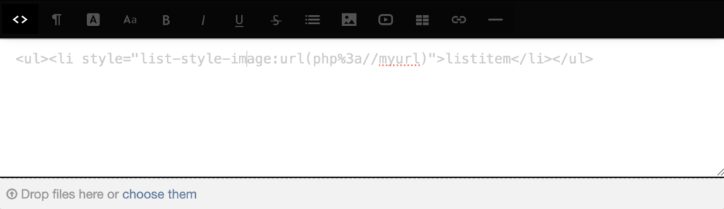 <ul><li style="list-style-image:url"(php%3a//myurl)">listitem</li></ul>