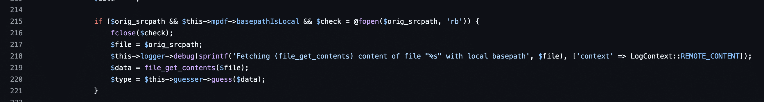 We began by analyzing mPDF, the third-party PHP library osTicket uses to generate PDF documents from support tickets. This functionality is accessible to any user authorized to view a ticket, including unauthenticated guests if the helpdesk is configured for guest ticket access (the default).