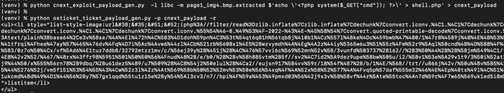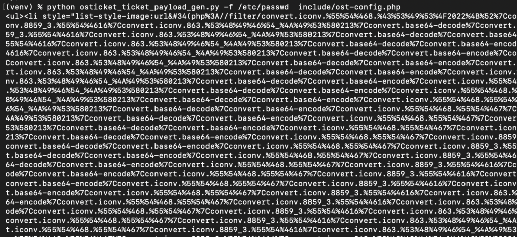 osticket_ticket_payload_genscript accounts for this by URL-encoding uppercase letters in the payload. - Encoding Variations: While standard filter chains work for text, binary files can be finicky. We found that wrapping the data in Base64 or zlib+Base64 filters before the BMP transformation yielded stable results for binary files. Our