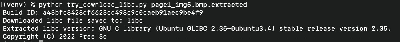 Next we fingerprint the partial libc library using the NT_GNU_BUILD_ID and download the full libc from https://libc.rip/ using the pwntools library.