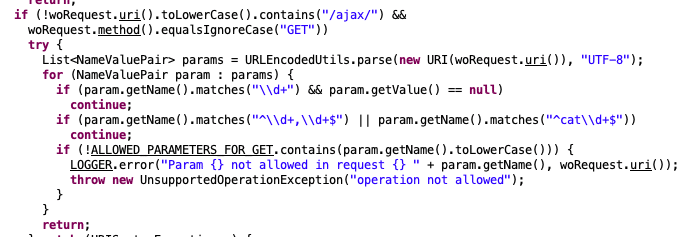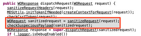 When filtering requests destined for WebObjects (via “wo” in the request path), the “checkCsrfTokenWo()” function is invoked. This function not only validates that the CSRF token is valid, but also validates request query parameters against a whitelist.