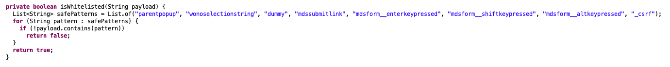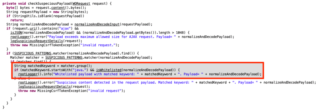 Additionally, the blacklist used in the existing “checkSuspeciousPayload()” (typo theirs) function is able to be bypassed via the “isWhitelisted()” function.