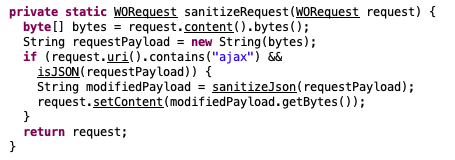 This sanitize function determines whether or not a request is destined for AjaxProxy by checking if the URI contains “ajax,” which is insufficient. The request handler for ajax components is nearly identical to the request handler for typical web objects, so simply changing the request URI from “ajax” to “wo” is sufficient to bypass this new sanitization routine.