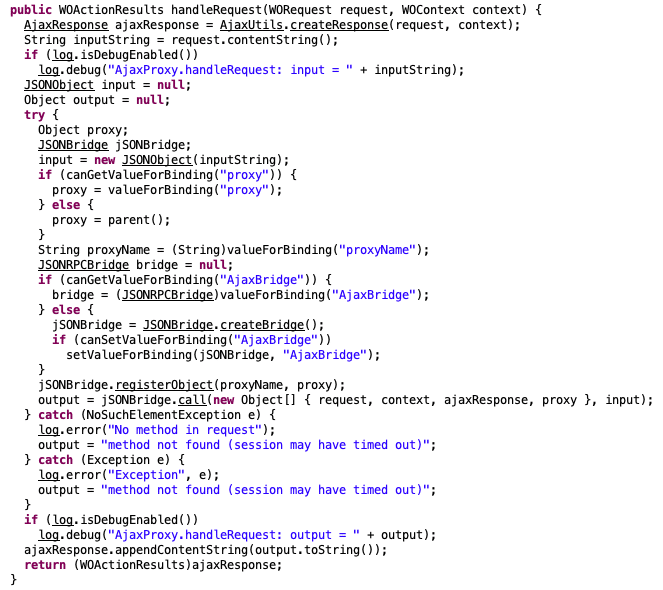 From this, we can see that when handling requests destined for components that utilize this functionality, the jabsorb library (a lightweight JSON-RPC library) is used to dynamically load and execute various component actions, which are just different methods defined for the component’s class. jabsorb is known to contain a variety of code execution issues when not properly restricted with many publicly available gadgets. So how do we get to the point of being able to access this feature?