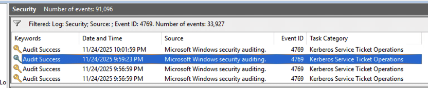 - Event ID: 4769 (A Kerberos service ticket was requested)