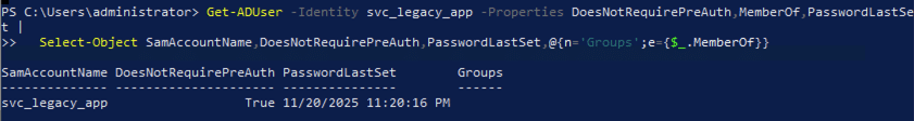 svc_legacy_app - Pre-authentication: Disabled (“Do not require Kerberos preauthentication” checked)