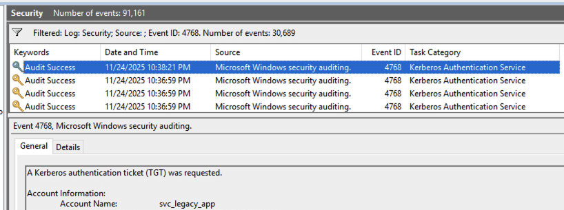 When the attacker requests the AS-REP, the Domain Controller logs the authentication attempt: