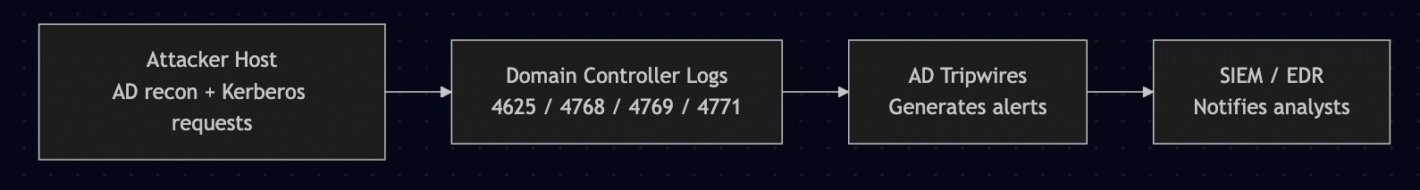 - What are AD Tripwires? Purpose-built tripwire accounts (exposed credentials, Kerberoasting, AS-REP) seeded in AD to light up the second an attacker pokes credential material.