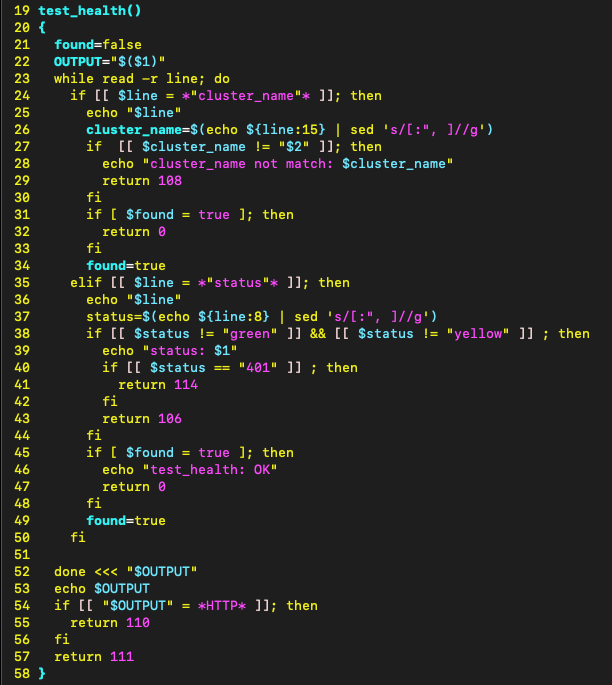 The test_health function takes the fully constructed curl command and executes it via OUTPUT=”$($1)” on line 22.