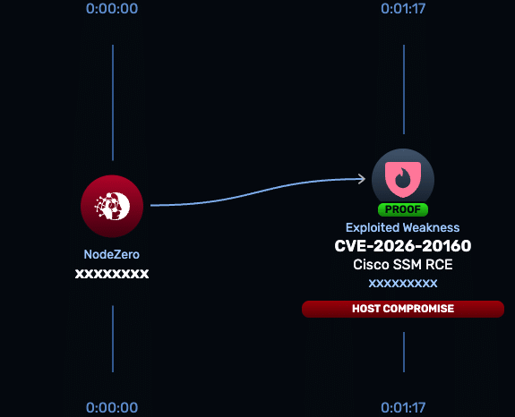 The NodeZero Rapid Response test for CVE-2026-20160 validates whether Cisco Smart Software Manager On-Prem is exploitable in your environment. The test safely exercises the exposed service to determine if unauthenticated command execution is possible.