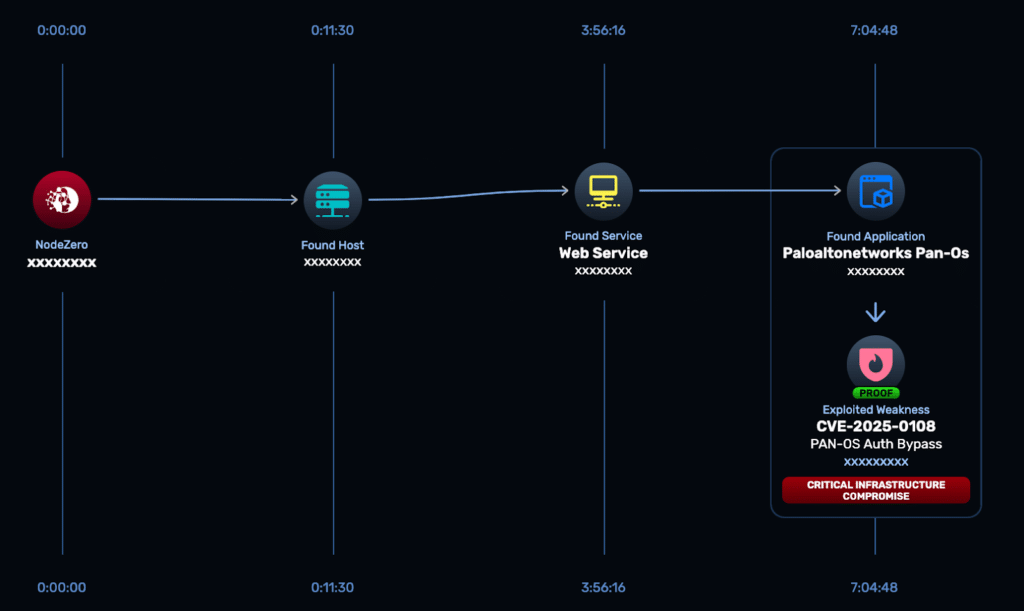 That same proactive approach was applied during an internal pentest, where NodeZero identified a critical PAN-OS vulnerability (CVE-2025-0108) listed in CISA’s Known Exploited Vulnerabilities catalog. Using Rapid Response, the team validated exploitability and demonstrated a path to critical infrastructure compromise.
