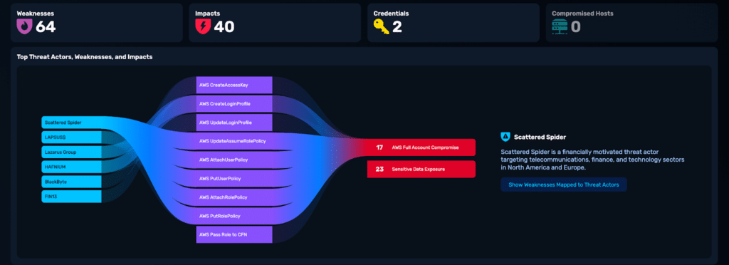 Image 3: Mapping discovered cloud IAM weaknesses to Scattered Spider TTPs and validated business impact.