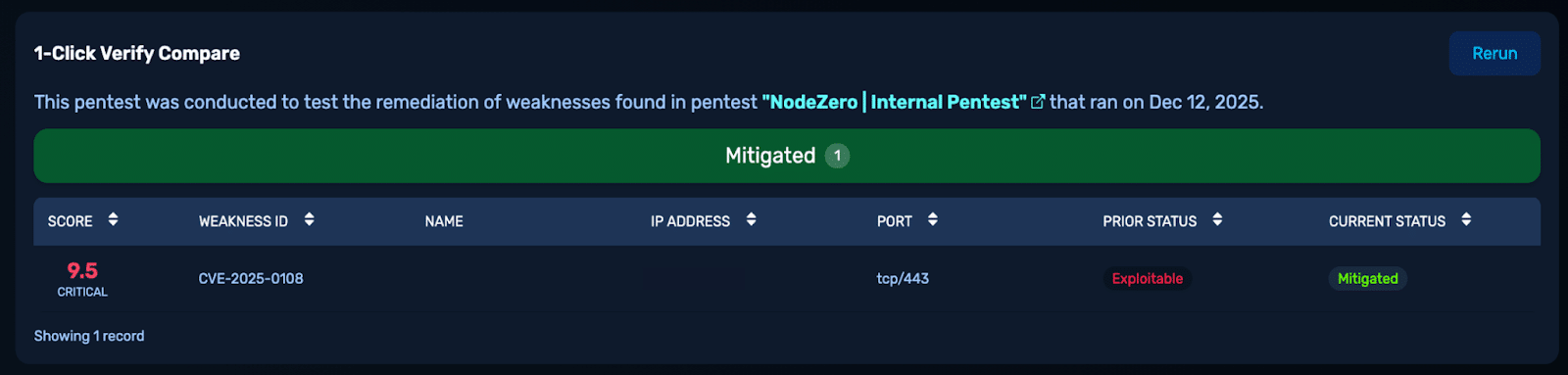 One-click verification confirming CVE-2025-0108 is no longer exploitable after patching.