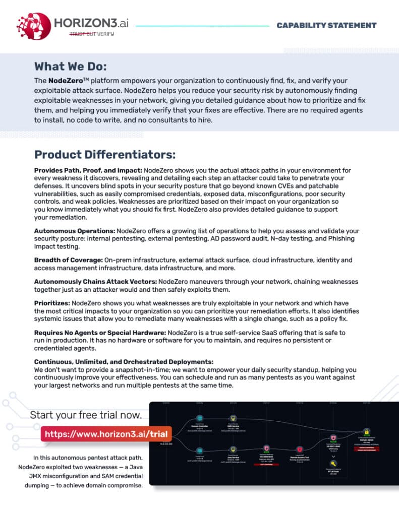 The NodeZeroTM platform empowers your organization to reduce your security risk by autonomously finding exploitable weaknesses in your network, giving you detailed guidance about how to prioritize and fix them, and helping you immediately verify that your fixes are effective.