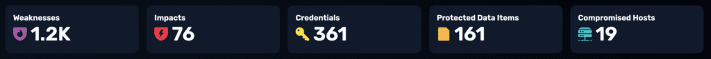 In a single baseline test, NodeZero uncovered 76 critical business impacts, over 1,200 weaknesses, and 361 compromised credentials.