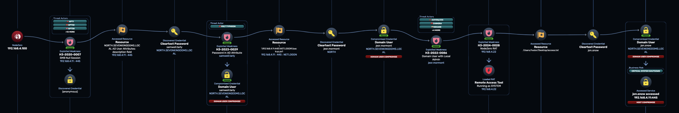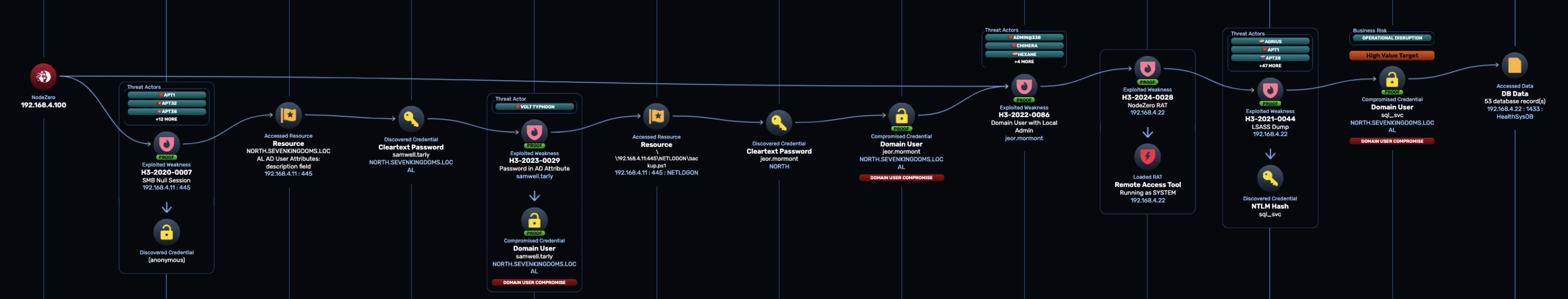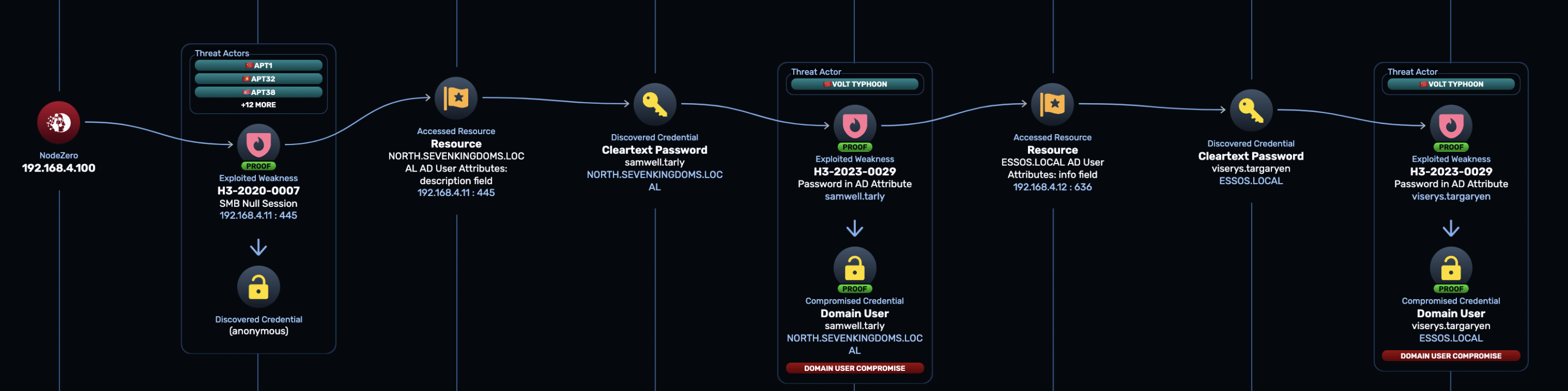 Let’s look at how NodeZero leverages ADP during a pentest. We built these scenarios using a modified version of the well known Game Of Active Directory (GOAD) cyber range.