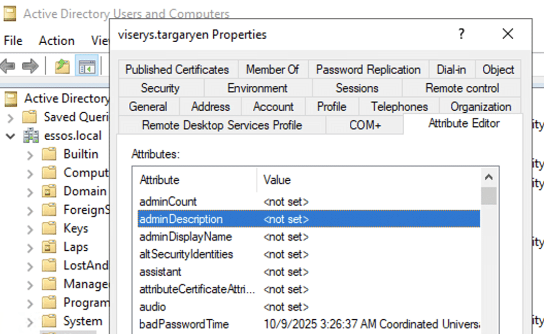This LLM-powered analysis isn’t just for Description and Notes. NodeZero also searches for passwords in the adminDescription and comment fields. These fields are editable using the Attribute Editor in Active Directory Users and Computers. By default any domain user can read the values set in these fields.