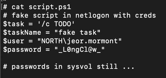 In a previous writeup about GOAD, we wrote about how NodeZero compromised a privileged domain user, jeor.mormont, by extracting his credential from a simple Powershell script file, script.ps1, in the SYSVOL share on a domain controller. That script file happened to be simple enough that a general-purpose regex is sufficient to pull out the credential. The context clue words “user” and “password”, appearing one line after another, are strong anchor words for a regex. And these regexes work reasonably well in real production environments.