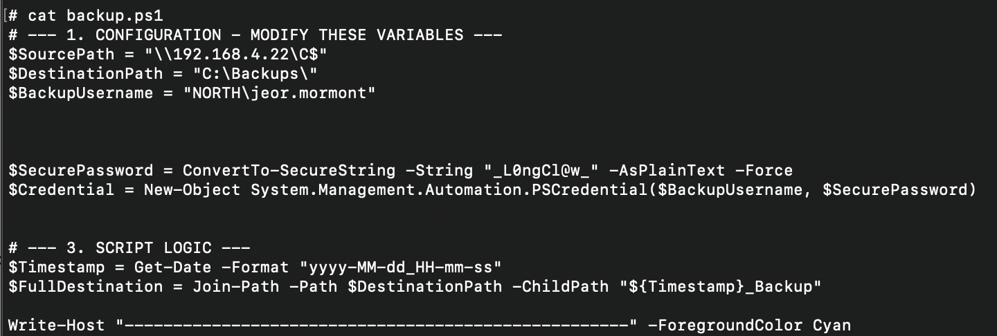 SYSVOLusingsamwell.tarly‘s credential and identifies the filebackup.ps1as likely to contain a credential - Uses an LLM to extract the credential for
