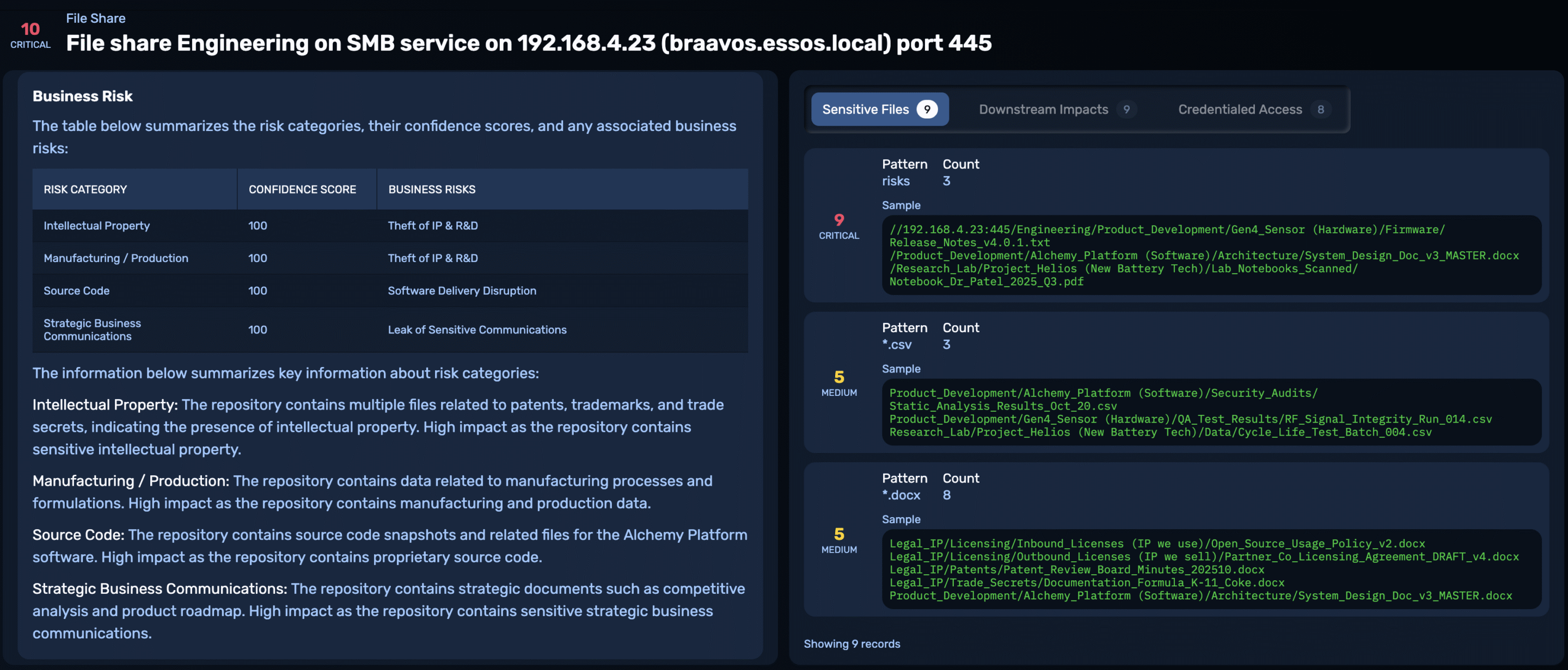 In this example, NodeZero determined that the share contained Intellectual Property, Manufacturing/Production data, Source Code, and Strategic Business Communications. It then automatically mapped these categories to the following business risks: