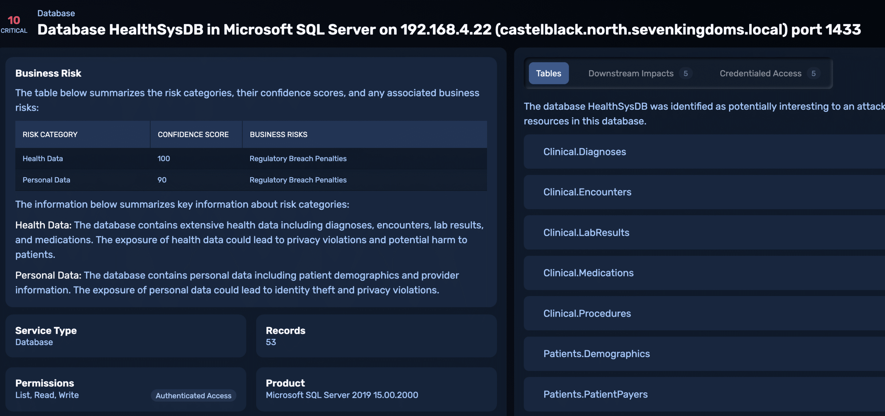NodeZero correctly infers that the database contains Health Data and Personal Data, as evidenced by the presence of “extensive health data including diagnoses, encounters, lab results, and medications” and “personal data including patient demographics and provider information.” It then links compromise of this database to Regulatory Breach Penalties as a business risk.