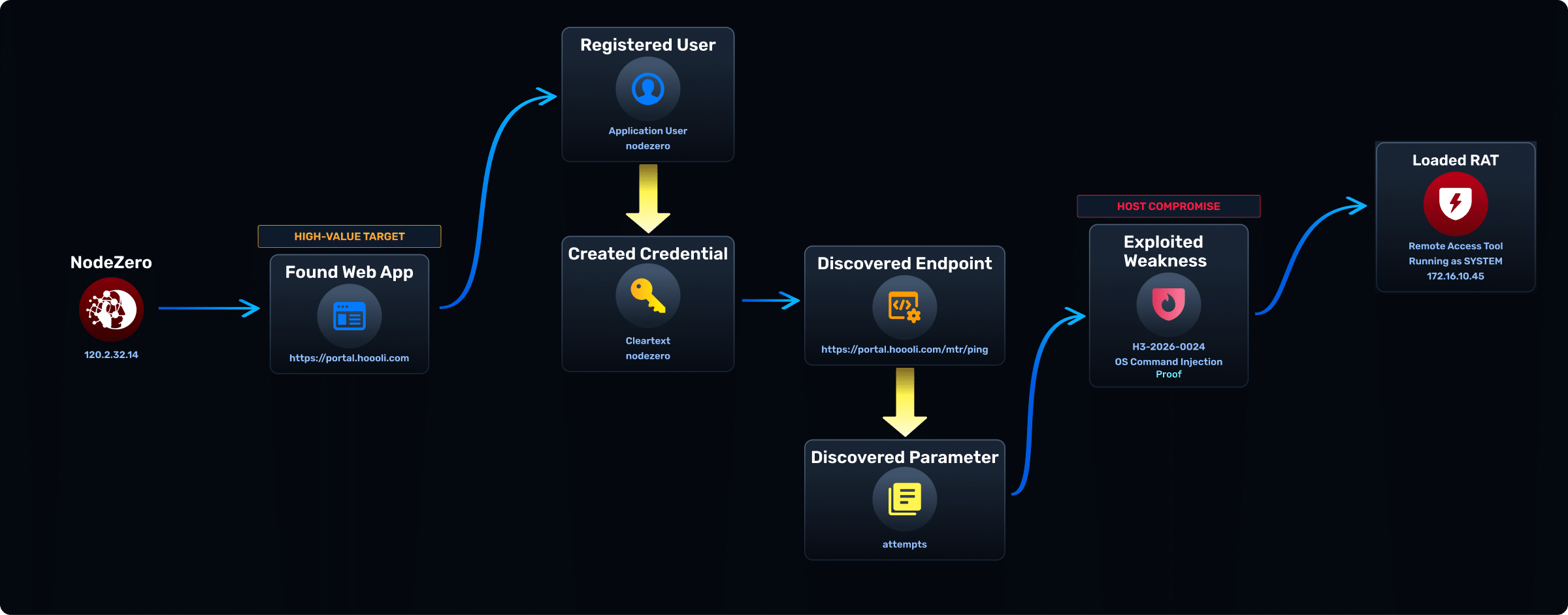 NodeZero® WebApp Pentest tests web applications the way real attackers operate. It traces real attack paths from authenticated access and application abuse through to cloud and on-prem host compromise, exposing real business impact, not isolated findings.
